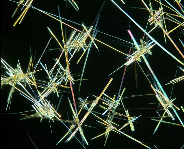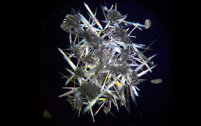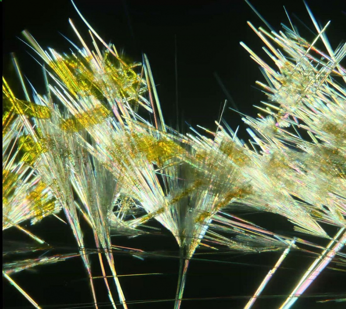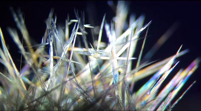 Igor Reicher wurde inspiriert durch Ruud Herolds Beitrag zur Mikrochemie. Auch Igors Ergebnisse sind beeindruckend und einfach schön. Was man mit solch einem simplen (Entschuldigung: High-Tech-) Sublimations-„Ofen“ hinkriegt! Man beachte die beiden in Eiswasser gelagerten Kühlkörper oben, es müssen aber dafür nicht unbedingt teure Objektive sein!