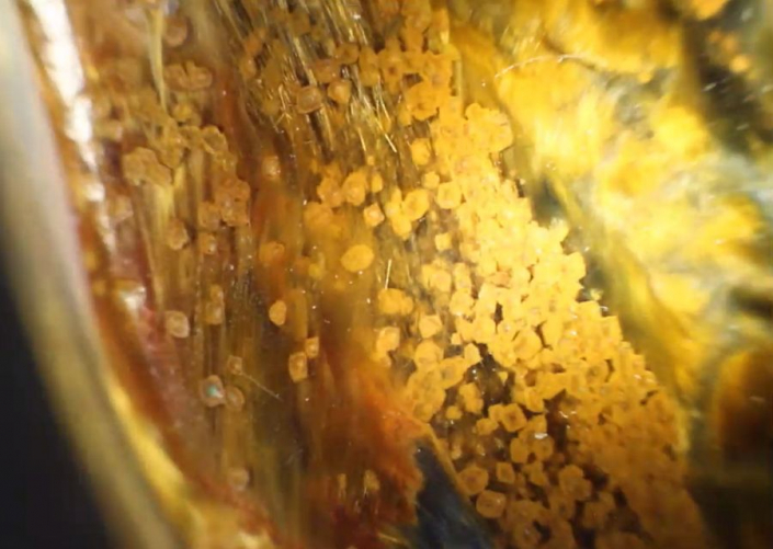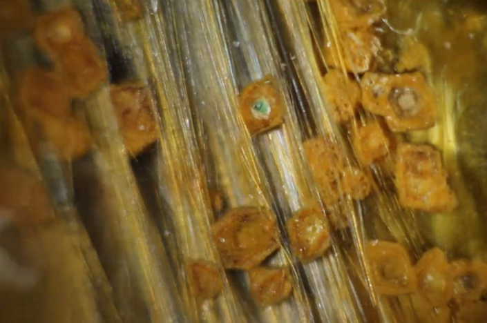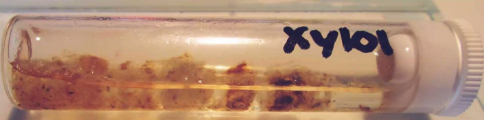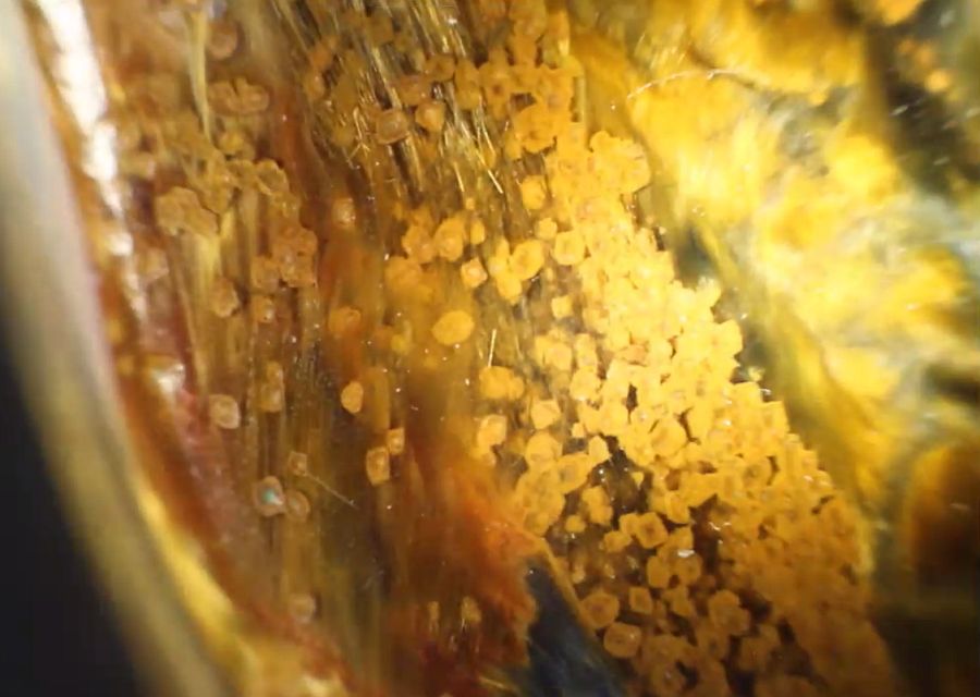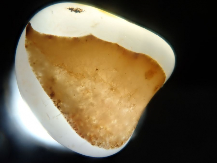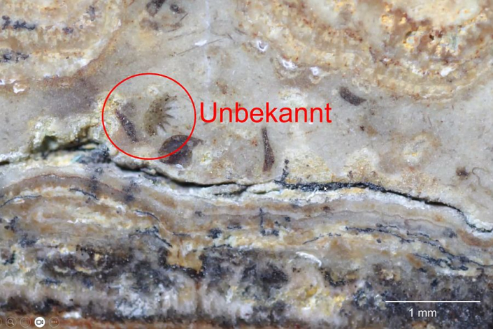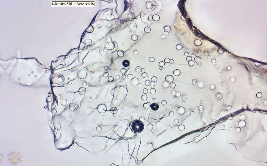 - Bernstein mit Einschlüssen hat Günther Dorn in Xylol gelöst und untersucht. Da wir ebenfalls nichts identifizieren konnten, sind die Bilder nun unter UMOs zu finden → UMOs – Unbekannte Mikroskopische Objekte (biologische)