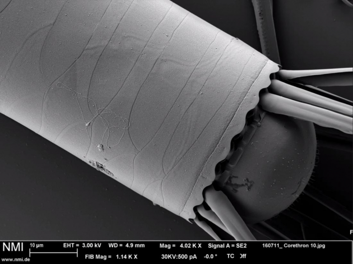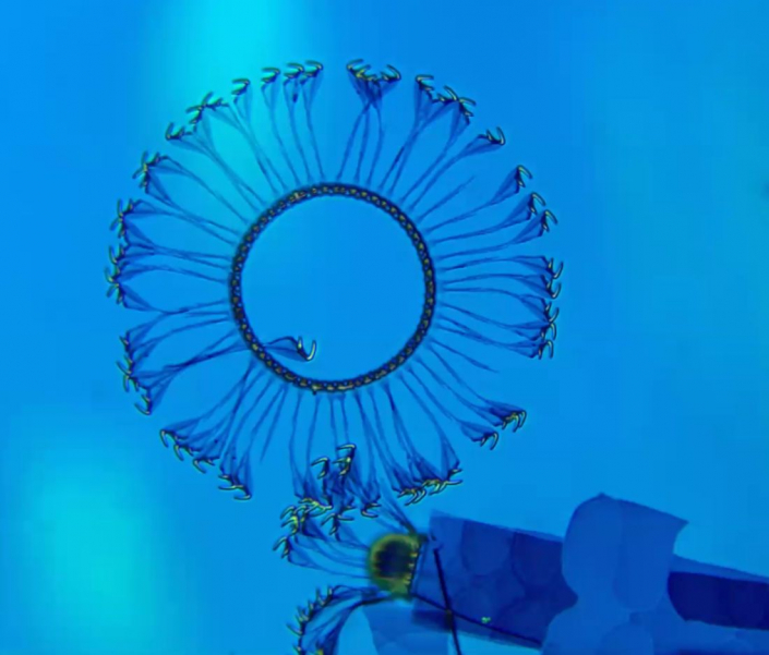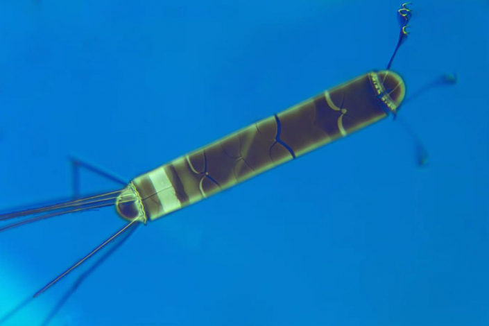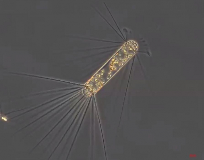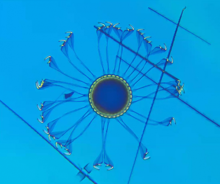 - Die Diatomee Corethron sticht sogar unter den vielen besonders bizarren Diatomeenformen heraus. Lange Stacheln ja, aber unglaublich sind die die auf langen, beweglich gelagerten dünnen Stielen sitzende Haken. Über ihre Funktion wird spekuliert, dass sie die langen Stacheln während der Teilung bündelt. Bilder von Anne Gleich, im Jamin-Lebedeff-Verfahren bunt „aufgemotzt“, da die Technik gerade zur Verfügung stand.
