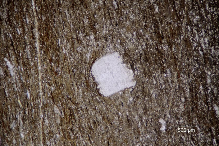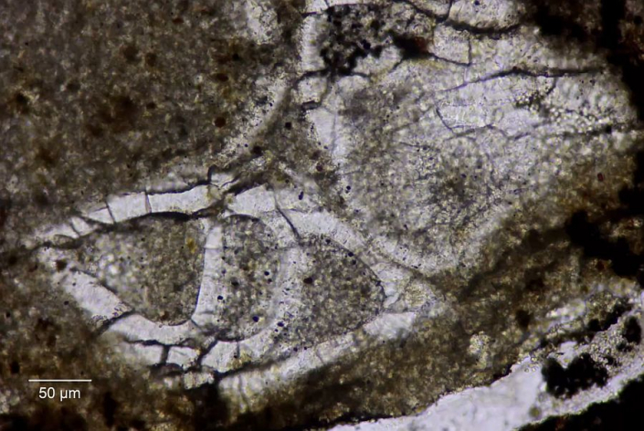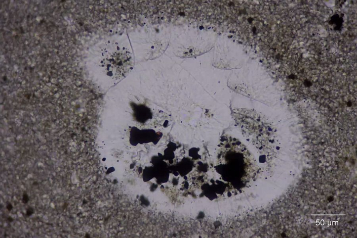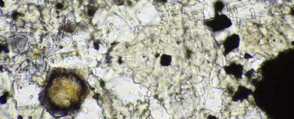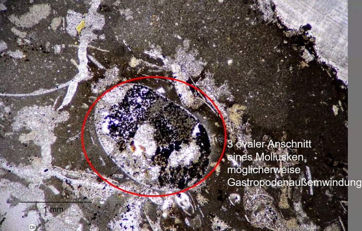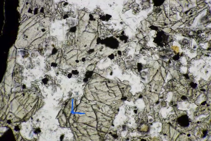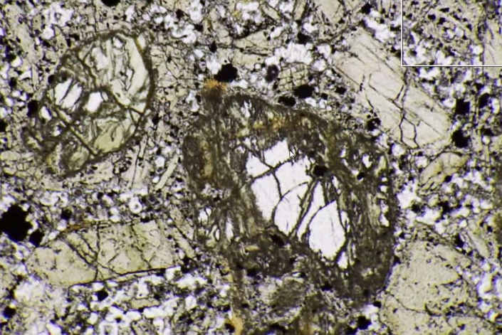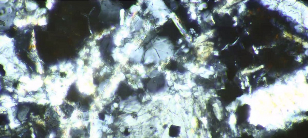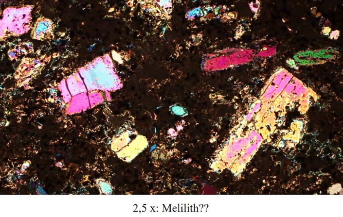 - Eine Nachtrag von Florian Dufey zum Basalt vom Eisenrüttel: Augit und serpentinisierten Olivin hatten wir ja letztes Mal gesehen. Fehlt noch der Nephelin und Hauyn. Bilder in LPOL und XPOL. Hier sieht man zum einen den Nephelin (transparente, klare, hexagonale Kristalle mit niedrigem Brechungsindex und niedriger Doppelbrechung, sowie Nosean (oder Hauyin), erkenntlich an den vielen Einschlüssen (schwarzer Rand), niedrigem Brechungsindex und fehlender Doppelbrechung (kubisches System). Dazwischen opake Minerale wie Magnetit, die sich im Durchlicht nicht gut ansprechen lassen.