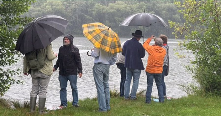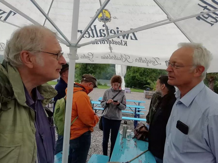 - Am Baggersee bei heftigem Regenwetter, aber mit 9 Teilnehmern! Massenhaft Ceratium, seit langem wieder Weiherrüsselkrebschen Bosmina, lebhafte Strudelwürmer, wenig Cyanophyceen, Cyclops-Nauplien. An Steinquadern auf der Schattenseite angeheftet fanden wir Moostierchen. Auch wenn’s draußen ungemütlich war, anschließen im Café Lieb ging es trocken weiter.