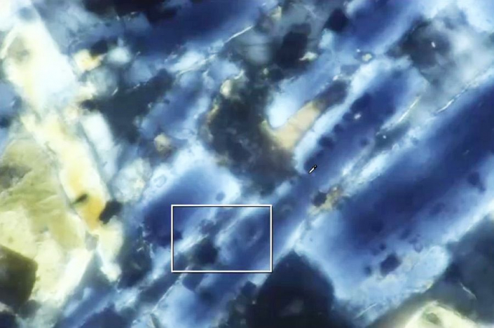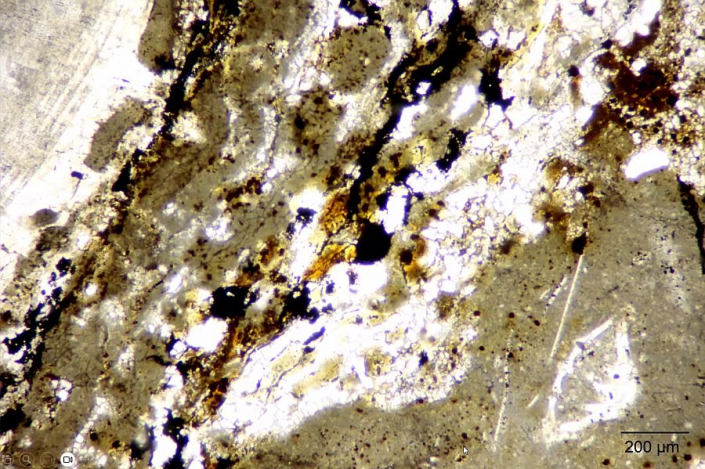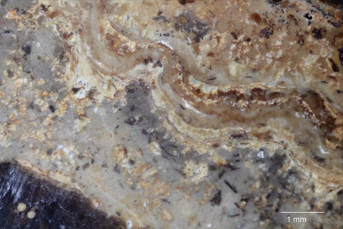 - Interessante Strukturen im „Pietersit“ (eine Handelsbezeichnung). Asbestfasern dabei.