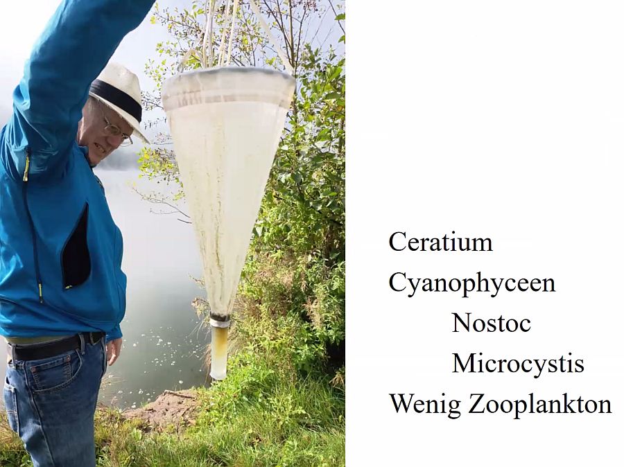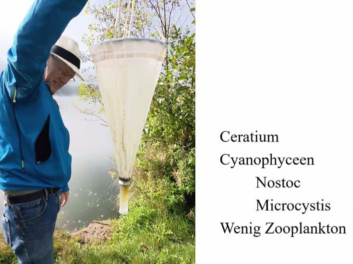 - Baggersee-Tümpeln bei schönstem Wetter mit 12 Teilnehmern. Im Planktonnetz eine braungrüne Brühe mit massenhaft Ceratium, Cyanophyceen (Nostoc, Microcystis), auffallend wenig Zooplankton (praktisch keine Wasserflöhe, wenig Copepoden. In der im Marmeladenglas mitgenommenen Probe waren am nächsten Tag alle Ceratium tot (obwohl Dinoflagellaten eigentlich widerstandsfähig sind)!