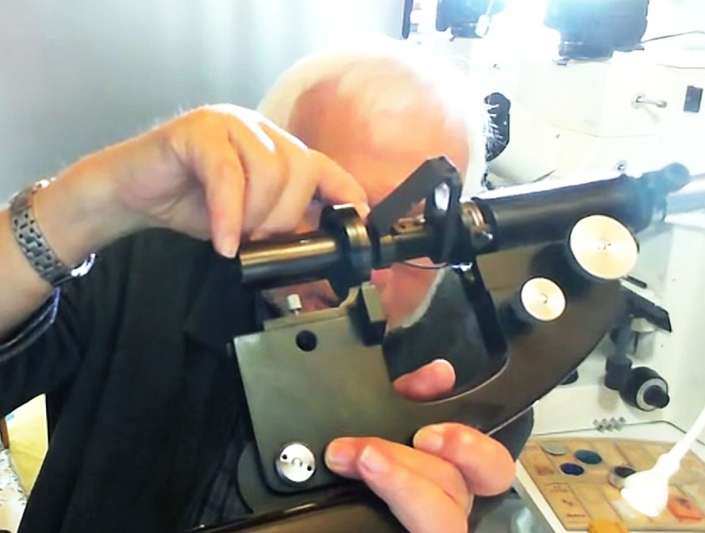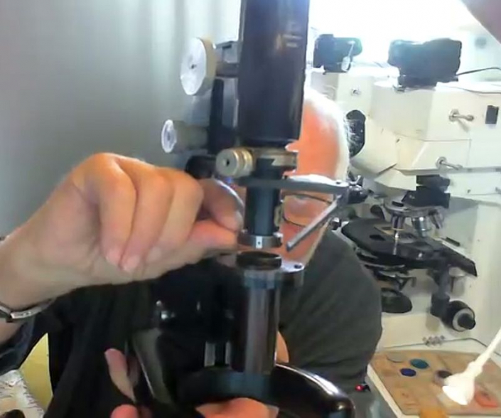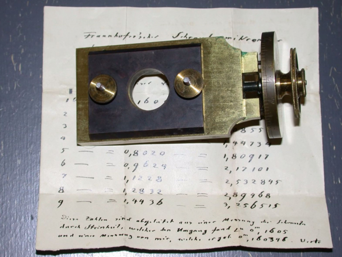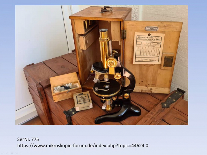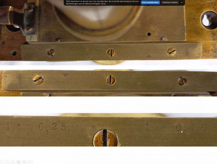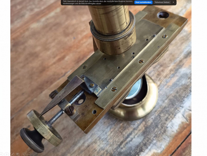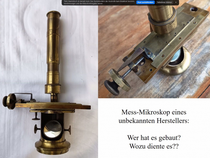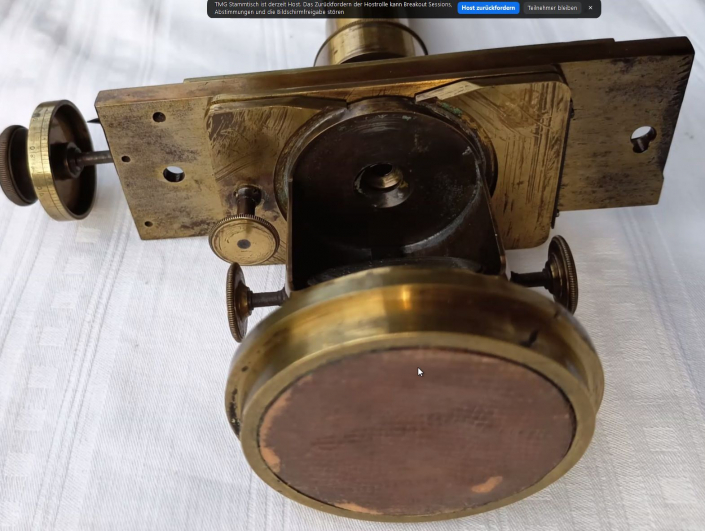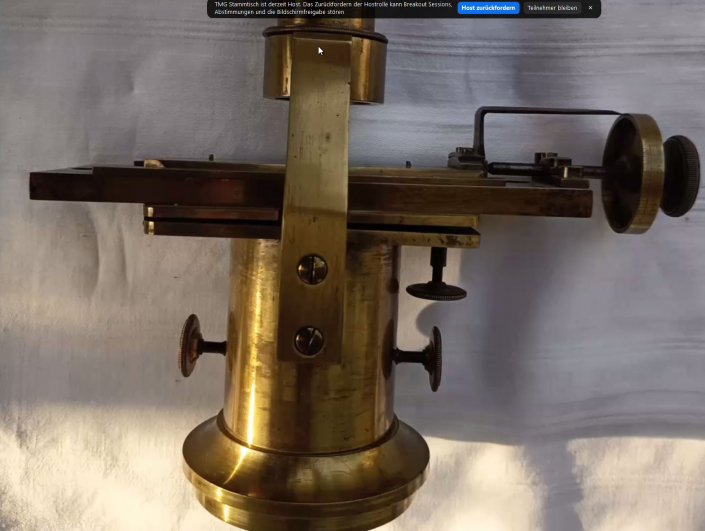 - Alfons stellte ein interessantes Messmikroskop mit einem Schraubmikrometer von/nach Fraunhofer vor. Mit Mohl’schem Tisch, Achat-Platte als Anschlag.