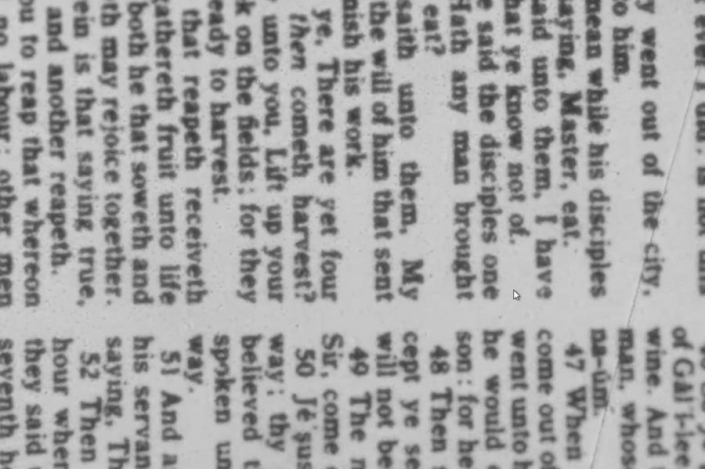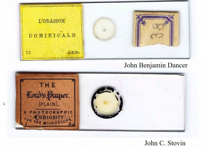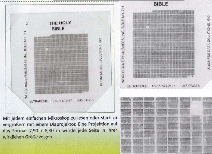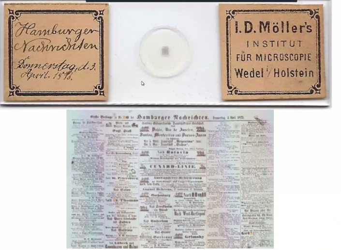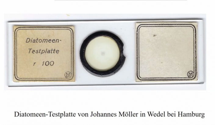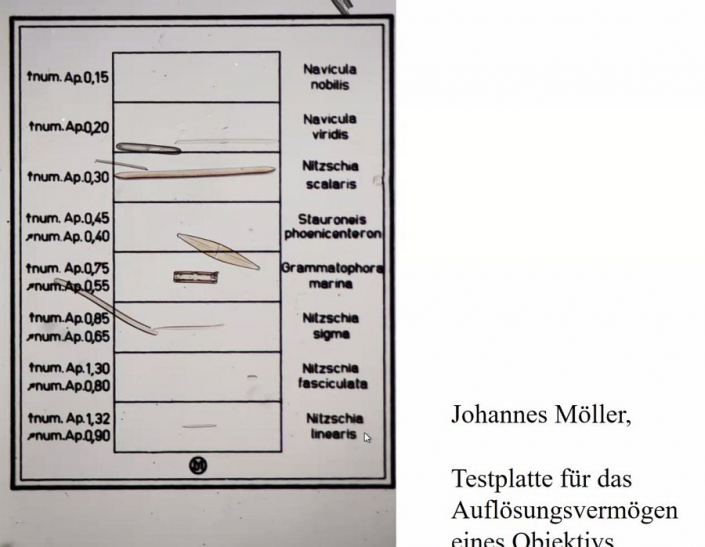 - Beim letztem Treffen (und im Mikroskopie-Forum) ging es auch um die Kunst der mikrophotographischen Objekte, mit Beispielen von Dancer, Möller etc. Ein gängiges Maß dieser Kunst war die Angabe, wieviele Bibelseiten man auf ein Inch verkleinern kann („Bpi“). Bis heute hat sich diese Einheit in leicht modifizierter Form erhalten. Das erklärt auch, weshalb man oft das Vaterunser oder ähnliche Texte als Objekte der Mikroaufnahmen findet. Inzwischen habe auch ich ein Exemplar der ‚kleinsten Bibel der Welt‘ erhalten und kann dessen Auflösung mit der des Vaterunsers von Dancer und dem Abendblatt von Möller vergleichen. Eine besonders eindrucksvolle Anwendung findet die Kunst der Mikrophotographie bei den Arrangements von Diatomeen von Möller, bei denen jede Diatomee in einem Rahmen mit ihrem Namen montiert ist.