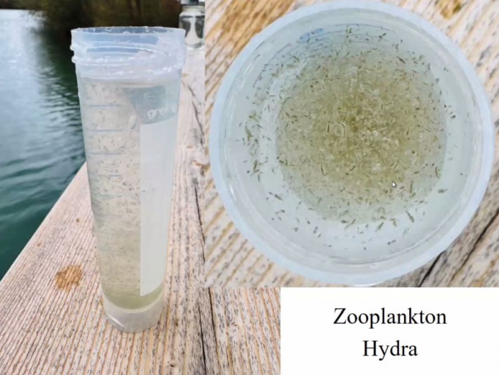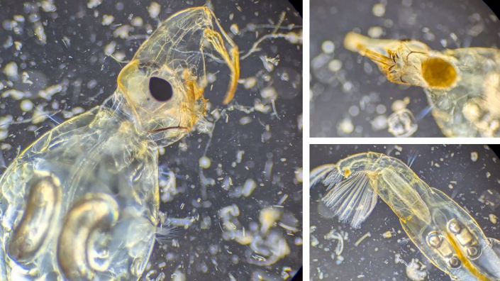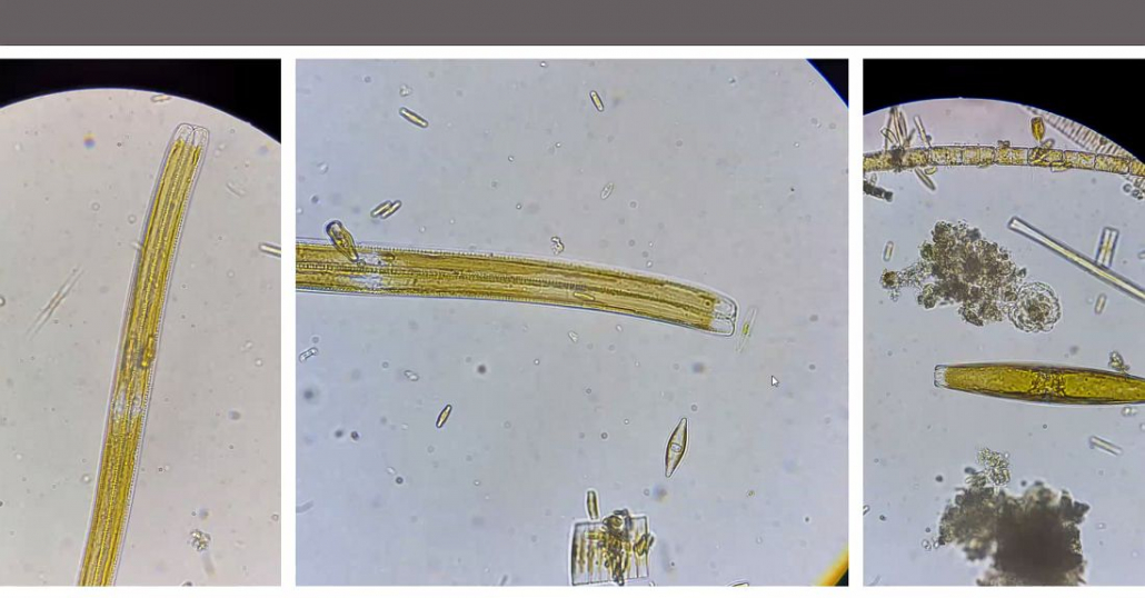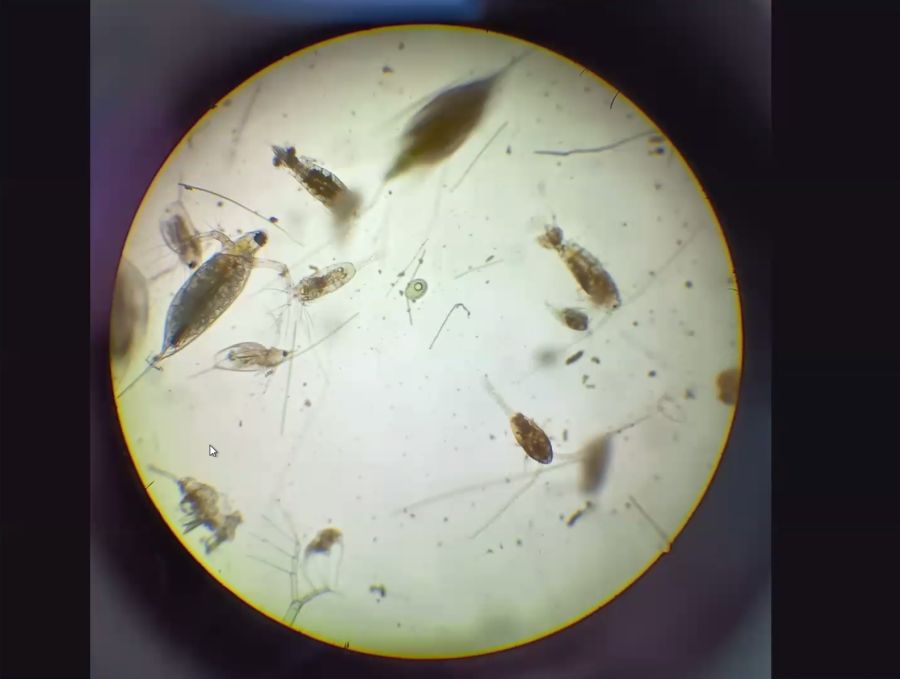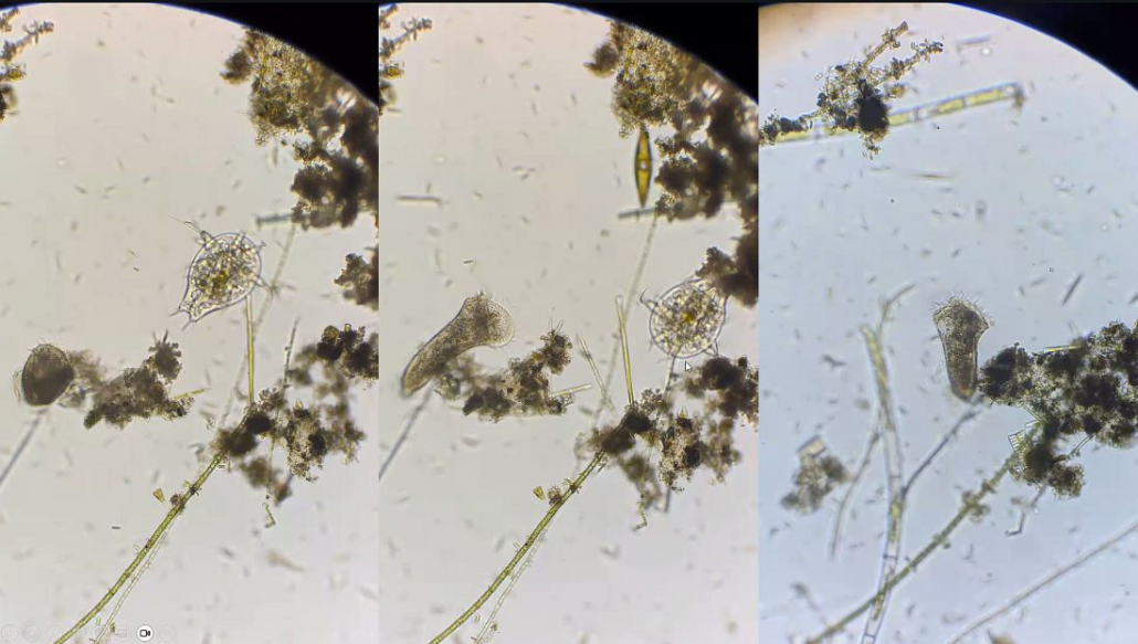 - Aus einem Vollmaringer Biotop hat Nicole Frisch Diatomeen, Stentor und eine Büschelmückenlarve schön in Szene gesetzt.