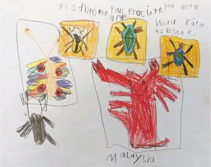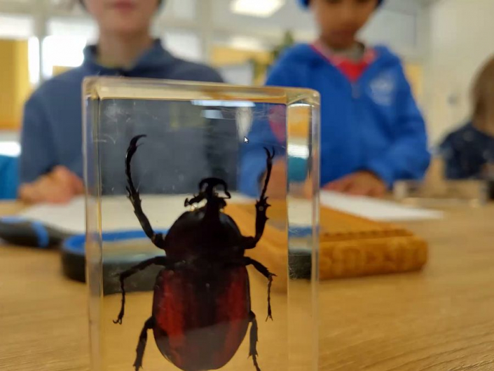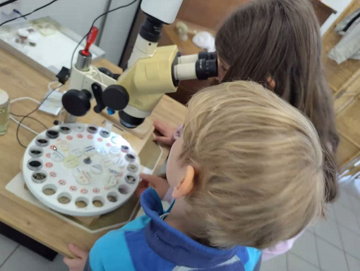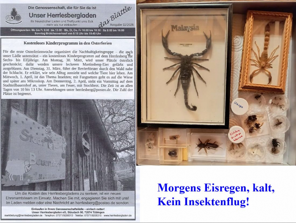 - Kinder-Insekten-Mikroskopieren auf dem Herrlesberg in Lustnau. Das Insekten-Sammeln war verregnet, aber präparierte Käfer aus aller Welt waren ersatzweise zur Stelle.